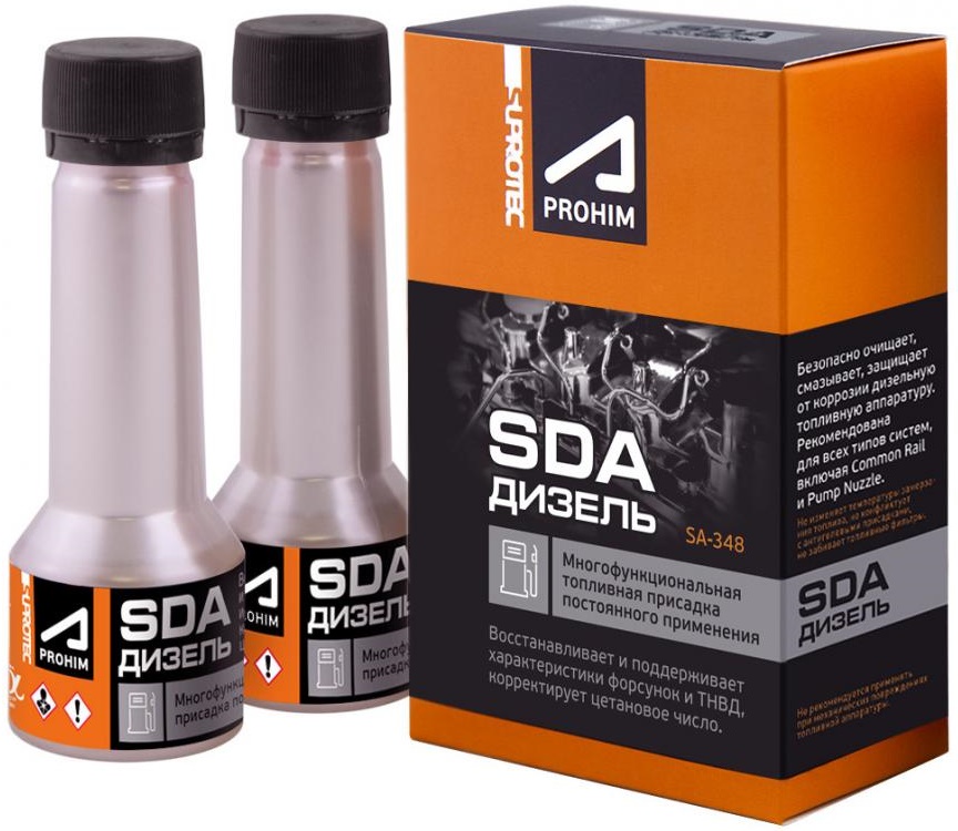 Присадка «SDA» («СДА») предназначена для восстановления и поддержания рабочих характеристик дизельных топливных систем, включая системы Common Rail и «насос-форсунка». Присадка очищает, смазывает, защищает от коррозии форсунки и топливные насосы, поддерживая их исправность. Приводит цетановое число топлива к оптимальным значениям.
